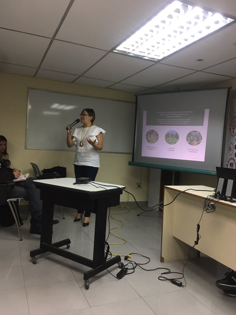La primera expositora fue Magdymar León, presidenta de Avesa. El título de su investigación es “Violencia sexual en la emergencia humanitaria compleja Venezolana”. León indicó que las emergencias humanitarias de esta magnitud vulneran los derechos humanos de las mujeres e influyen en el incremento de la violencia sexual. Agregó que la vulnerabilidad de las mujeres es mayor en contextos de desastre y escasez.