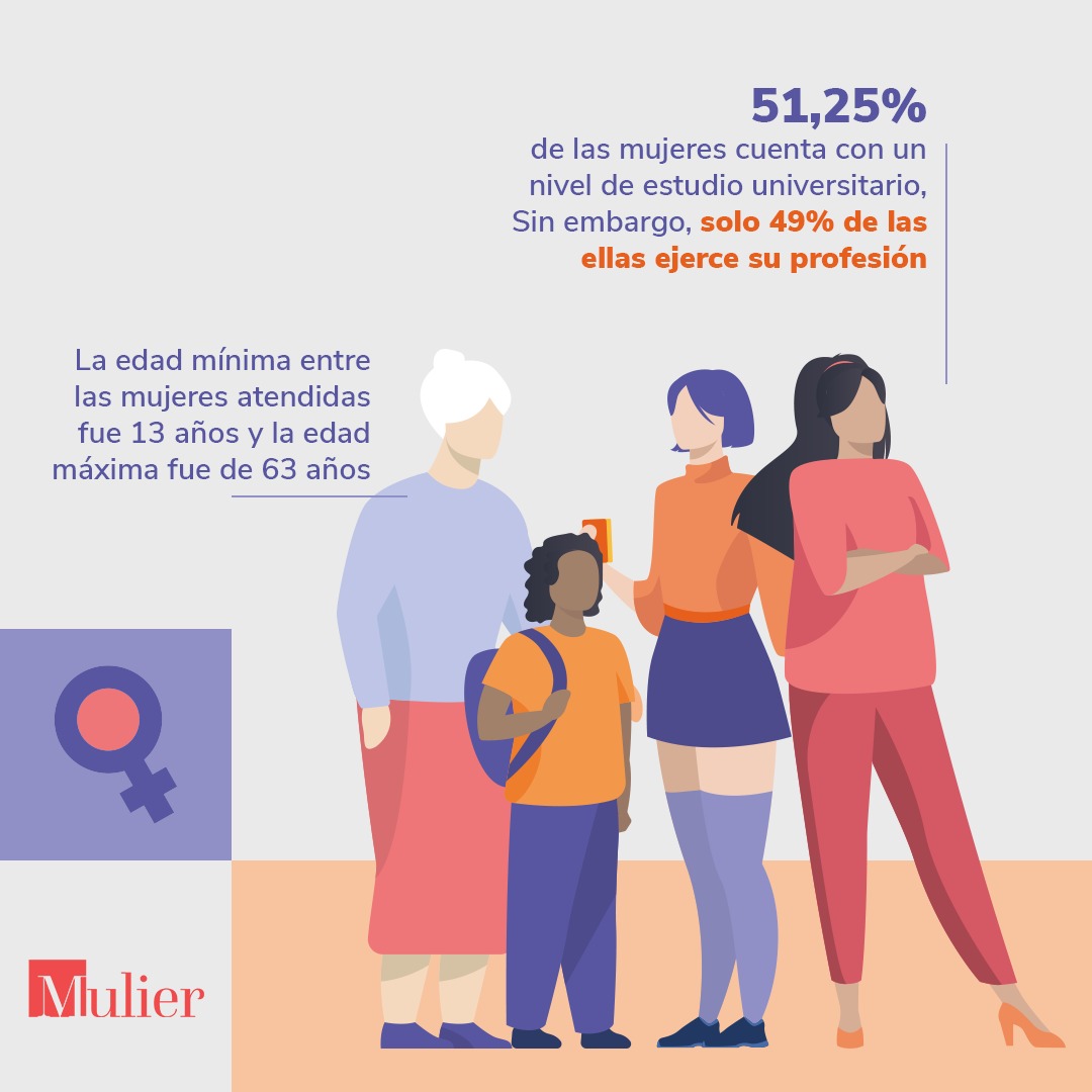 Las mujeres y niñas atendidas tienen una edad comprendida entre 13 y 63 años, donde el 51,1% cuenta con un nivel de estudio universitario. Otro aspecto importante que se documentó es que el 51% de las usuarias tienen entre 1 a 5 hijos, de los cuales el 59,8% eran niños y niñas menores de 12 años.