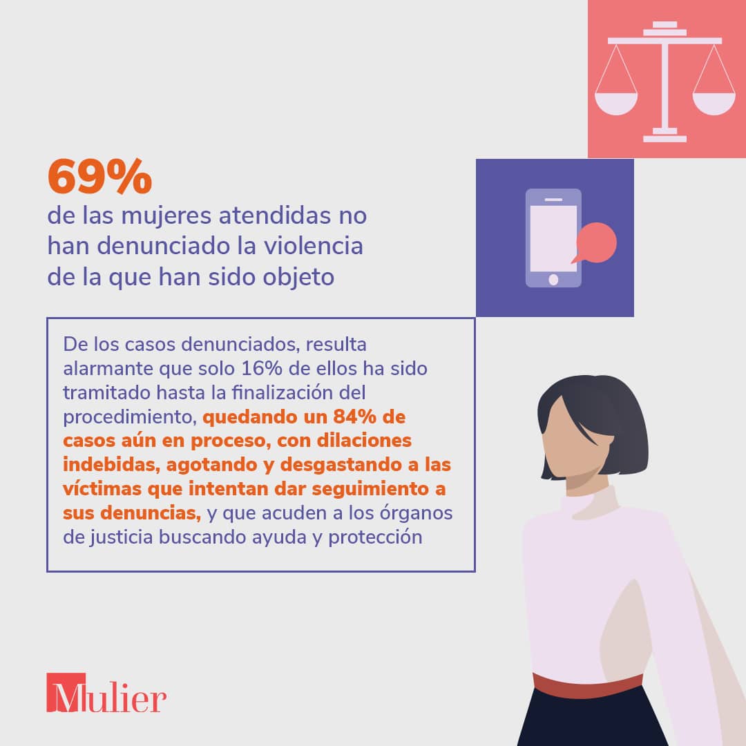 El 69% de las mujeres atendidas no denunciaron la violencia y en los casos que denunciaron, solo el 16% ha sido tramitado hasta la finalización del procedimiento, es decir, el 84% de los casos se encuentran en proceso y no han logrado justicia.