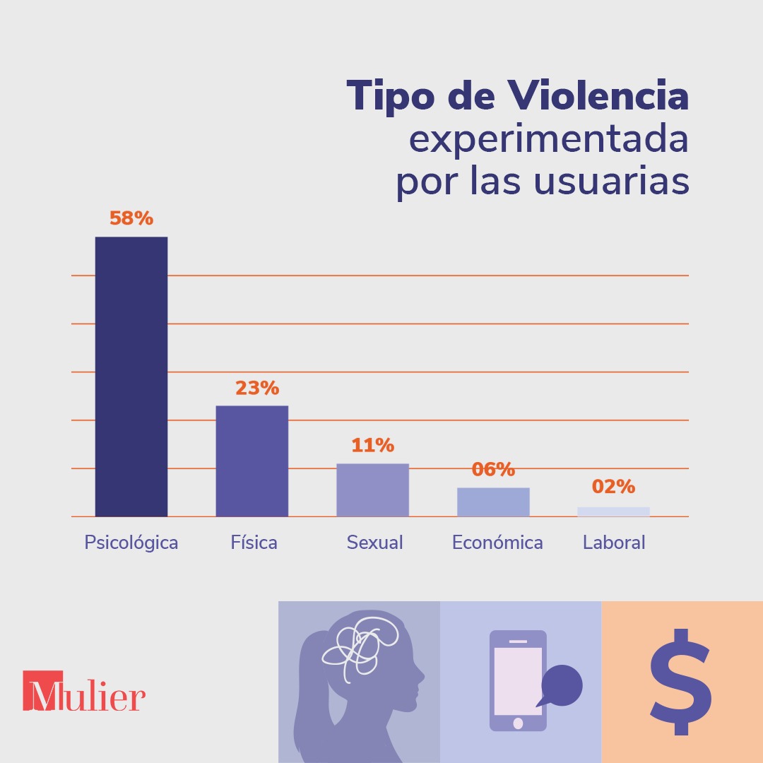 Los tipos de violencia experimentadas por las usuarias eran en 58% de los casos violencia psicológica, 23% violencia física, 11% violencia sexual y 6% violencia económica.