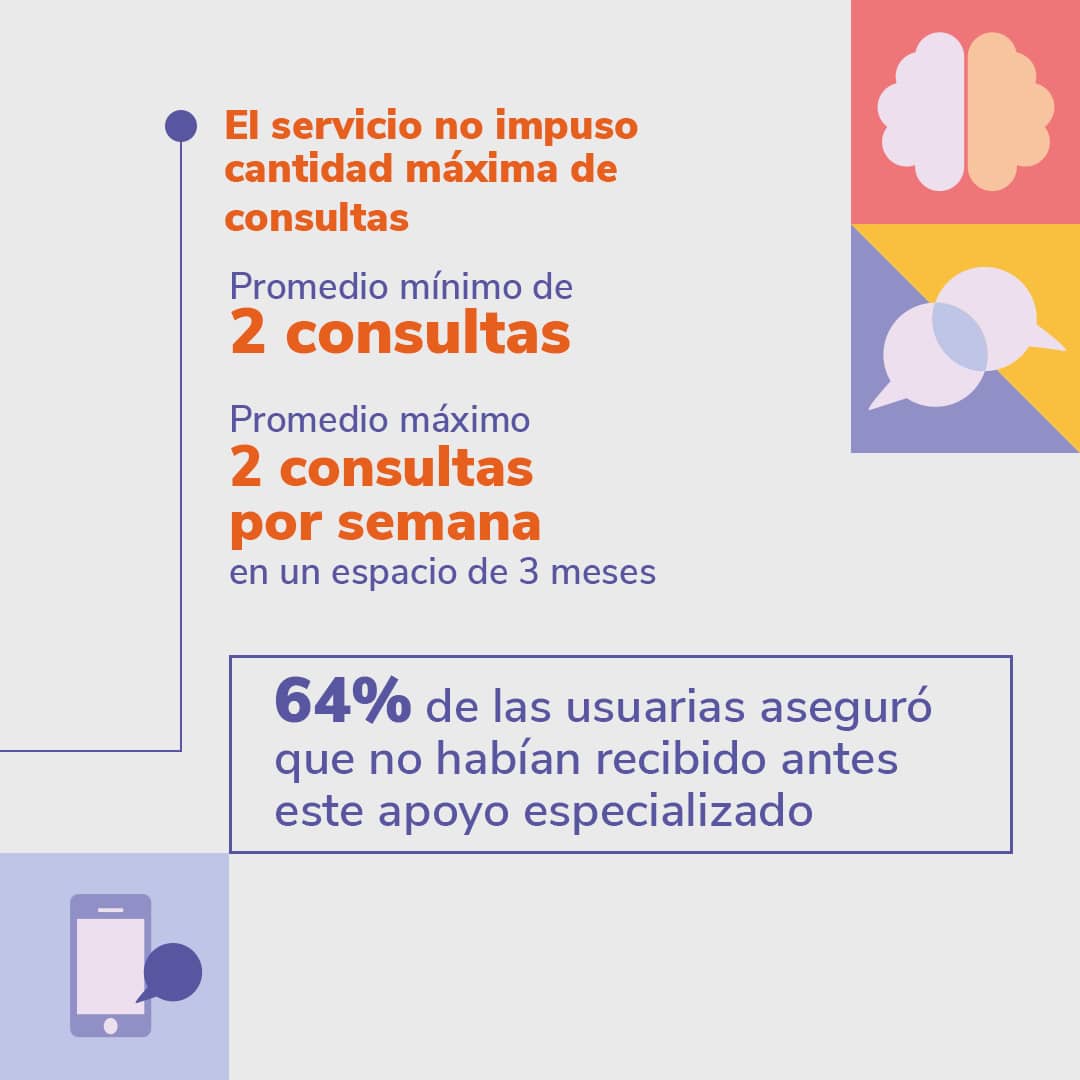 Mendoza comentó que el servicio no impuso una cantidad máxima de consultas. Las mujeres y niñas tuvieron un promedio mínimo de 2 consultas. El promedio máximo fue de 2 consultas por semana, en periodos de 3 meses, con mujeres en situaciones de crisis y violencia extrema, con acompañamiento preciso e importante.